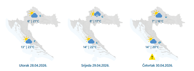Od srijede slijedi promjena vremena. U unutrašnjosti će kiša biti češća, a moguća je i na sjevernom Jadranu. U četvrtak se očekuje postupno razvedravanje sa sjevera, iako će u prvom dijelu dana kiše još biti na istoku i u Dalmaciji.