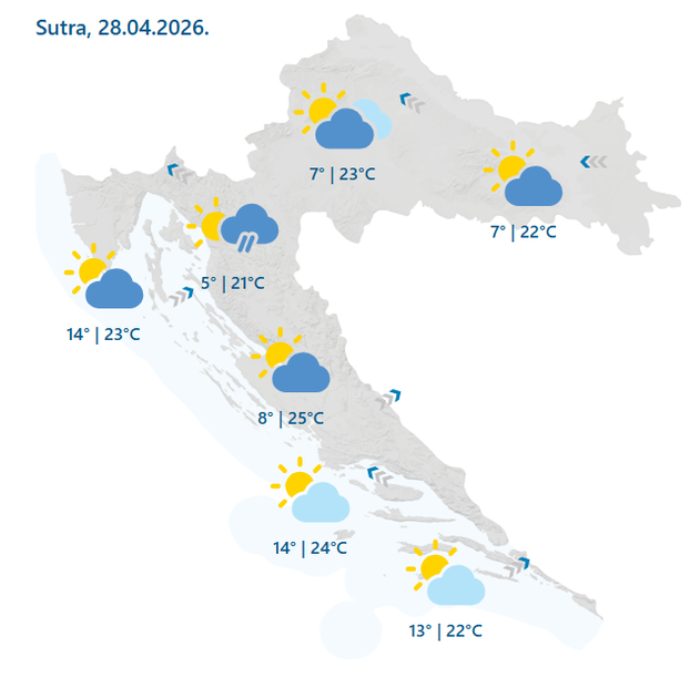 U utorak će biti djelomice, na Jadranu i pretežno sunčano, no tijekom poslijepodneva očekuje se postupni porast naoblake. U Gorskoj Hrvatskoj mogući su lokalni pljuskovi, a prema večeri raste vjerojatnost za kišu i u središnjim predjelima.