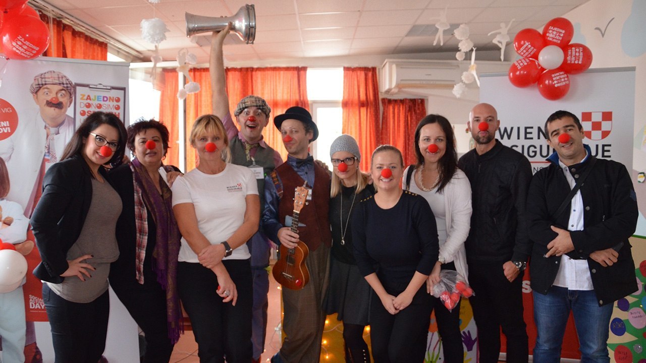 Male pacijente splitske bolnice danas su razveselili klaunovi-doktori iz udruge Crveni nosovi. Na dječji odjel stigli su u suradnji s Wiener osiguranjem, a da bi im barem malo uljepšali boravak u bolnici izveli su im priredbu „Između krajnosti“. U svemu su sudjelovala i djeca zaposlenika Wiener osiguranja. Oni su za svoje vršnjake izradili kolaže.