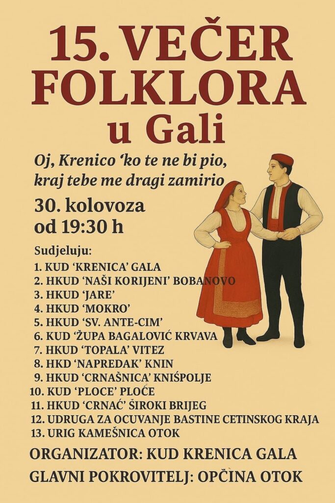 U subotu, 30. kolovoza, s početkom u 19:30 sati, Gala (općina Otok) ponovno postaje središte tradicije i kulturnog zajedništva – domaćin je jubilarnog 15. izdanja Večeri folklora pod nazivom “Oj, Krenico ‘ko te ne bi pio, kraj tebe me dragi zamirio”. Riječ je o manifestaciji koja već godinama okuplja kulturno–umjetnička društva iz Hrvatske i Bosne i Hercegovine, stvarajući mostove između regija kroz pjesmu, ples i običaje.