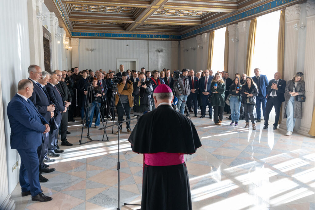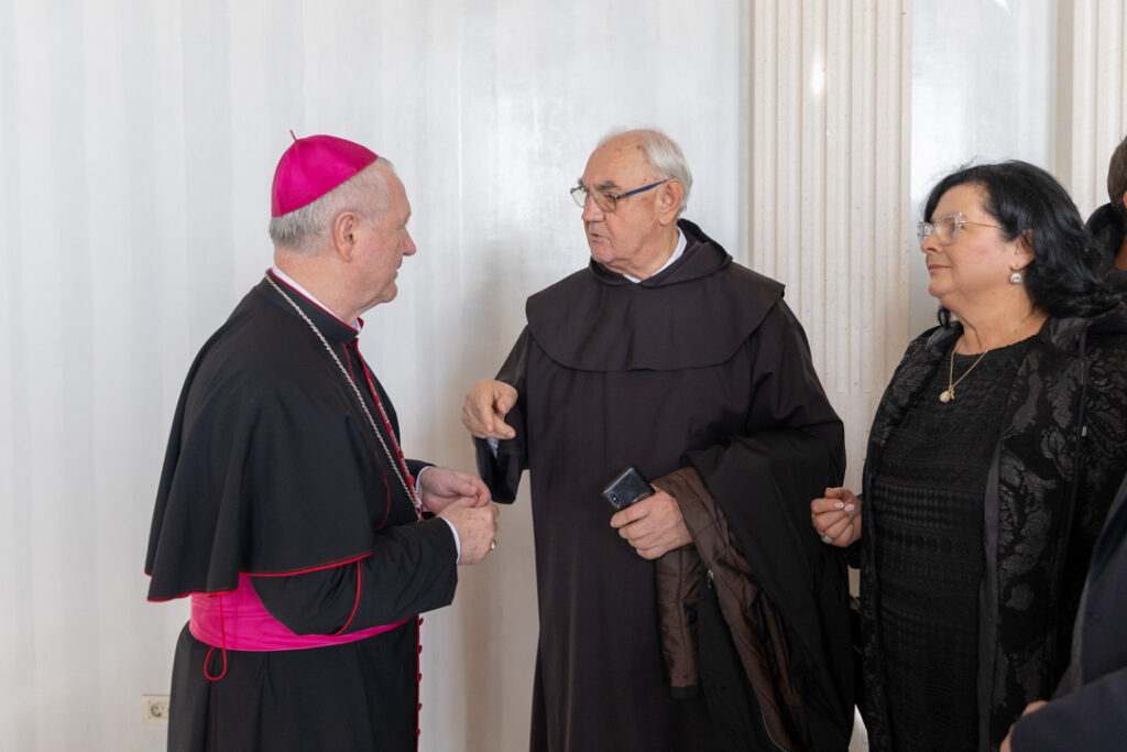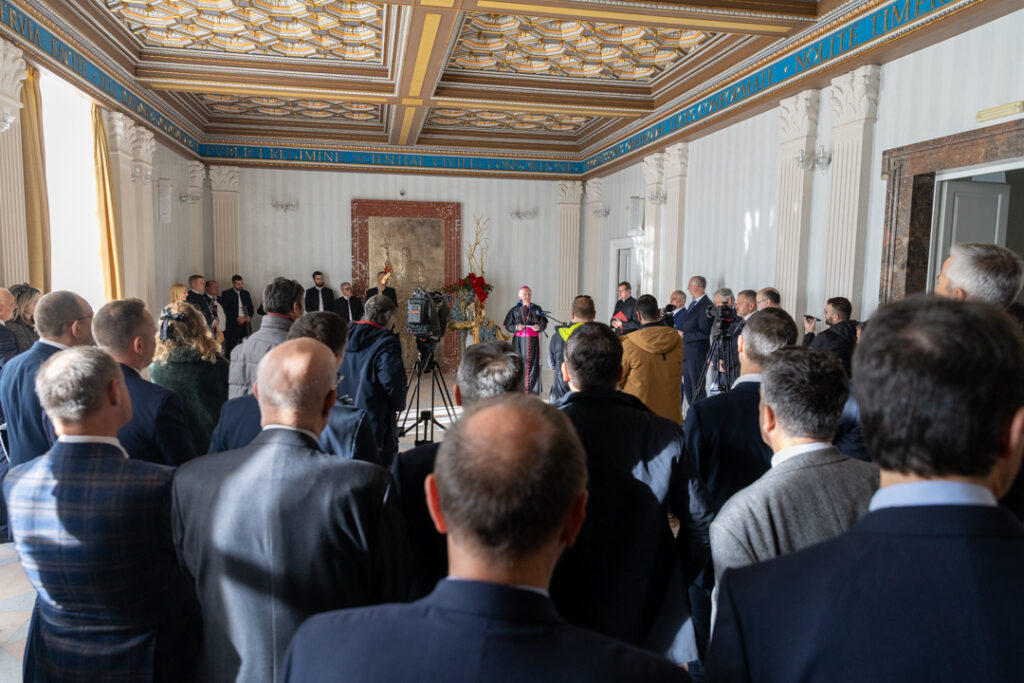U ime svećenika, đakona i vjernika Splitsko-makarske nadbiskupije čestitku je uputio generalni vikar Splitsko-makarske nadbiskupije mons. Franjo-Frankopan Velić. U svome je obraćanju osvijestio kako rečenice iz propovijedi sv. Ivana Pavla II. ispisane na zidovima dvorane pokazuju kako Crkva nije neka izolirana stvarnost u ovome svijetu, već da ona treba biti sol i svjetlo te dio ovoga svijeta. Nadalje je podijelio dva specifična vjernička iskustva u došašću, a to su mise zornice i sakrament svete ispovijedi. Kada su mise zornice i staro i mlado dolazi u crkvu ranom zorom jer u svome srcu osjećaju da trebaju jedan temelj koji ih nosi u promjenama i izazovima svakodnevice.