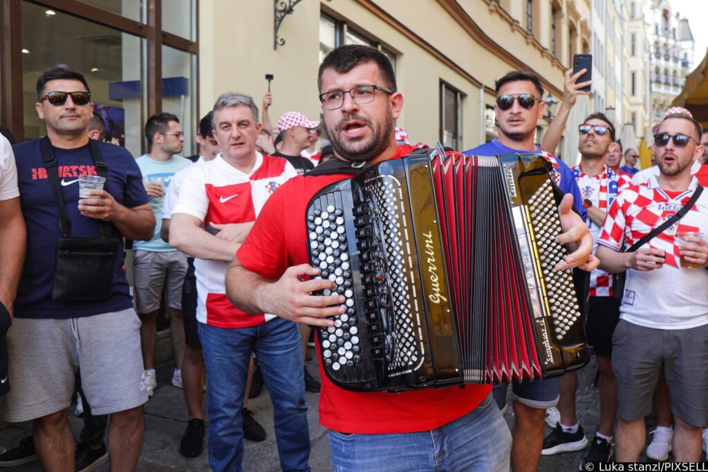 24.06.2024., Leipzig - EURO, Njemacka. Navijači u sve večem broju pristižu u grad. Započinje navijačka pjesma a uz harmoniku je ona još i upečatljivija. Photo: Sanjin Strukic/PIXSELL