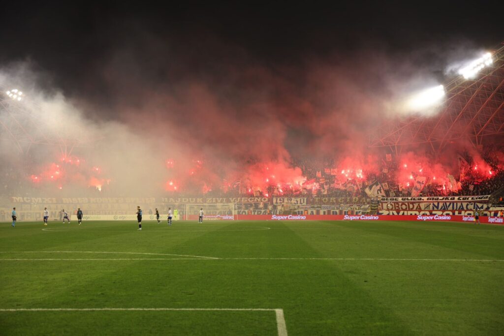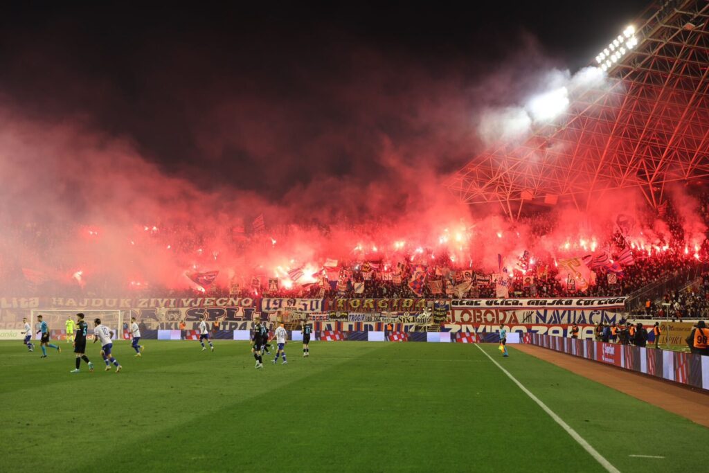 Na rasprodanom Poljudu krenula je spektakularna atmosfera, više od 30.000 navijača došlo je podržati Bijele na stotom jubilarnom Jadranskom derbiju.