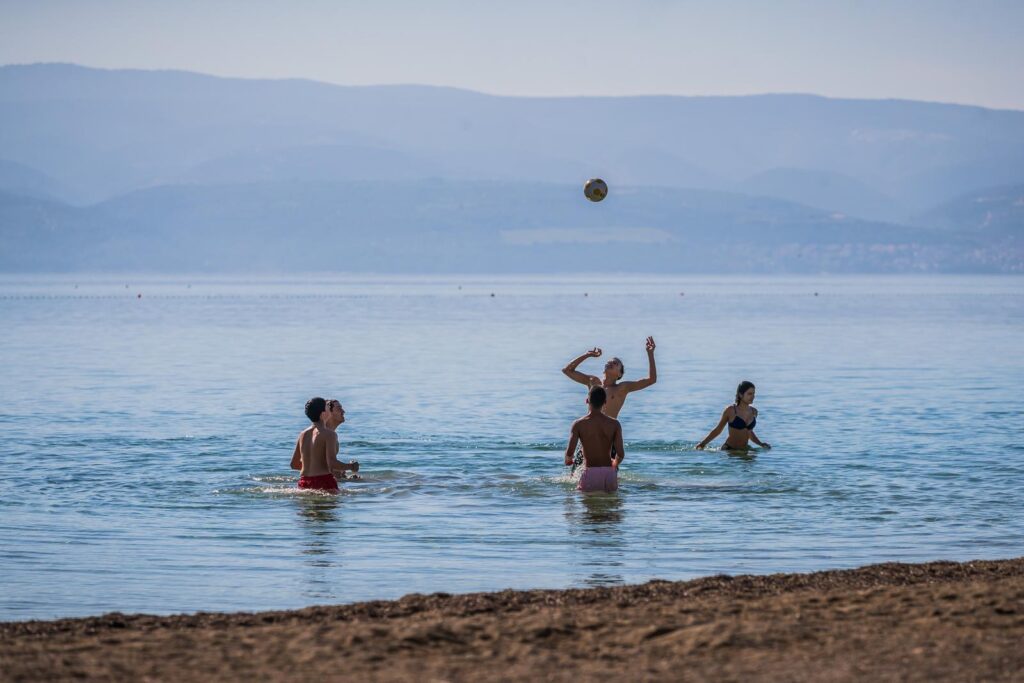 Iako je radni dan, plaža je ispunjena smijehom i veselim trenucima što podsjeća na vruće ljetne mjesece.