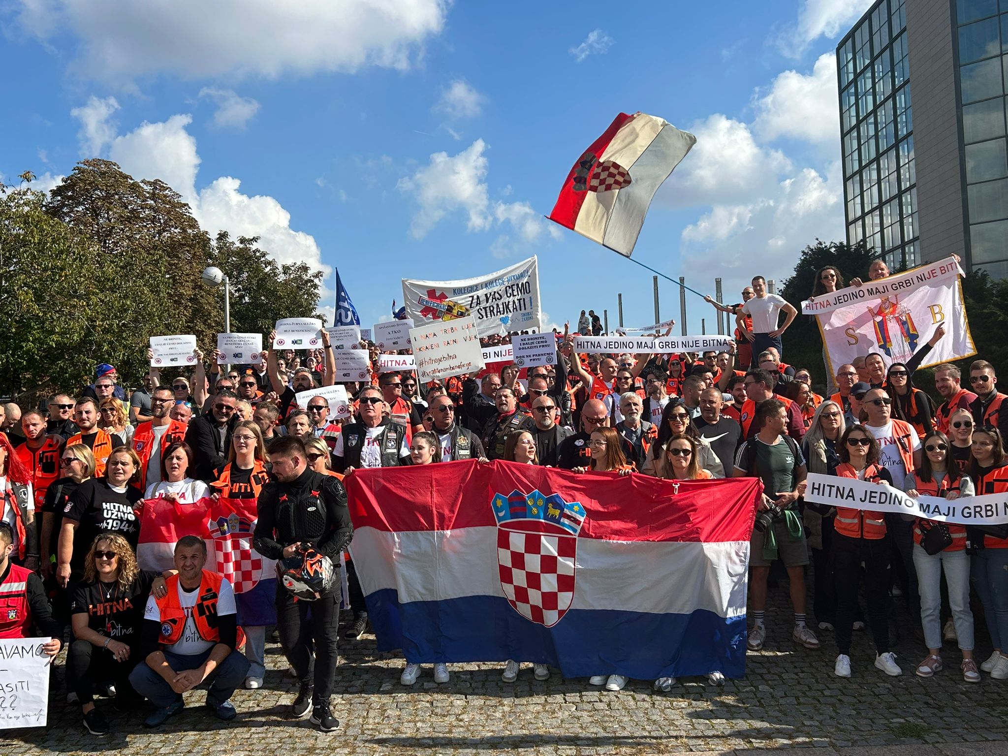 Djelatnici hitne medicinske službe okupili su se danas ispred Nacionalne i sveučilišne knjižnice u Zagrebu, za vrijeme sjednice Vlade, kako bi ponovno upozorili na teške uvjete rada i zatražili povrat beneficiranog radnog staža, donošenje zakona o hitnoj medicini te smjenu ravnateljice Hrvatskog zavoda za hitnu medicinu Maje Grbe Bujević.