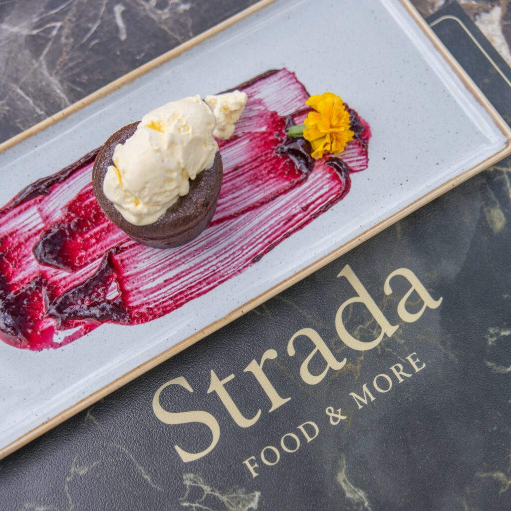 Kulinarski tim iz Strade potrudio se meni dovesti do savršenstva i tako omogućiti da svatko može pronaći nešto za sebe. Naglasak je na kvalitetnim lokalnim i sezonskim namirnicama i domaćem mesu kao jednom od najbitnijih segmenata u restoranu.