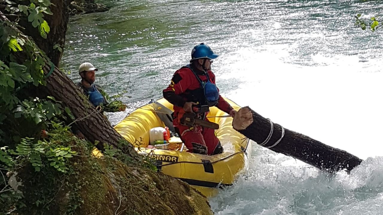 Troje članova HGSS Stanice Split i dva raftera uklonili su sva stabla na dionici plovnog puta od zaseoka Penšići do Radmanovih mlinica.