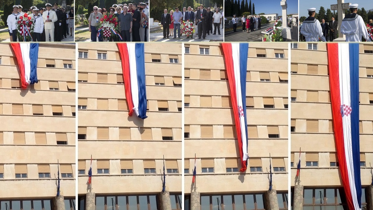 Vijenci su položeni i ispred spomenika u Parku hrvatskih branitelja kod zgrade Gradske uprave preko koje je jutros simbolično izvješena hrvatska trobojnica.