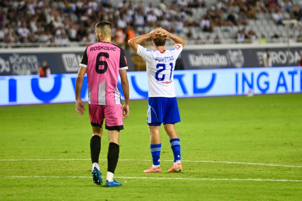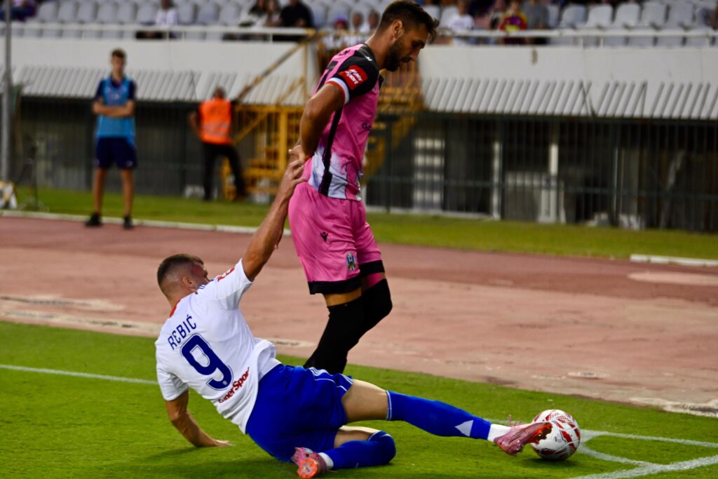 47 – Dobra šansa za Hajduk. Pred golom se našao Pukštas, ali njegov siloviti udarac odlazi malo poviše grede