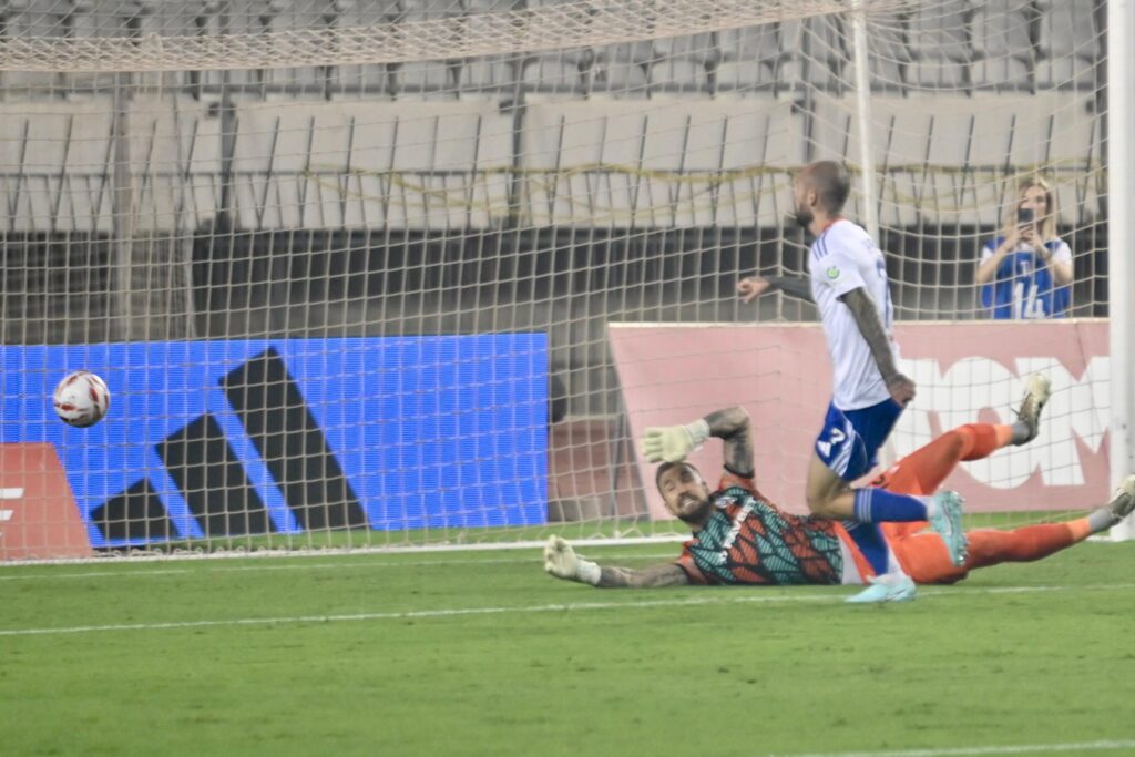 38 – Posavec neprecizno izbija, loptu uzima Hugo i šalje je prema Rebiću, u posljednji trenutak prije udarca otklanja Vešović, a naknadno je i svirano zaleđe.