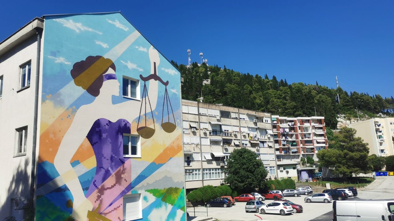 Završen je veličanstven mural s motivom božice pravde na zgradi suda u Pločama. Ovu vijest je podijelio gradonačelnik Mišo Krstičević.