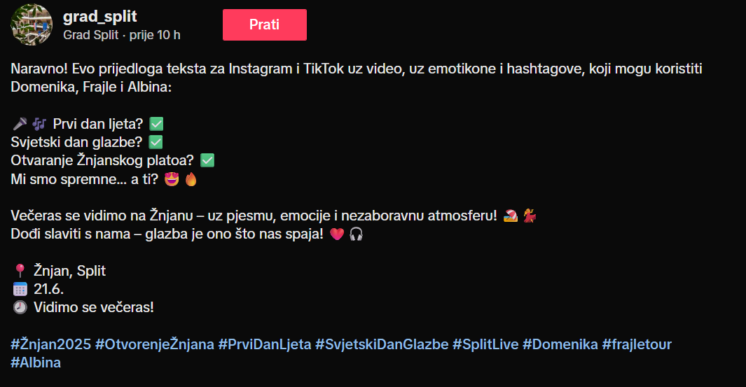 @grad_split Naravno! Evo prijedloga teksta za Instagram i TikTok uz video, uz emotikone i hashtagove, koji mogu koristiti Domenika, Frajle i Albina: 🎤🎶 Prvi dan ljeta? ✅ Svjetski dan glazbe? ✅ Otvaranje Žnjanskog platoa? ✅ Mi smo spremne… a ti? 😍🔥 Večeras se vidimo na Žnjanu – uz pjesmu, emocije i nezaboravnu atmosferu! 🏖️💃 Dođi slaviti s nama – glazba je ono što nas spaja! ❤️🎧 📍 Žnjan, Split 📅 21.6. 🕗 Vidimo se večeras! #Žnjan2025 #OtvorenjeŽnjana #PrviDanLjeta #SvjetskiDanGlazbe #SplitLive #Domenika #frajletour #Albina ♬ original sound – Grad Split