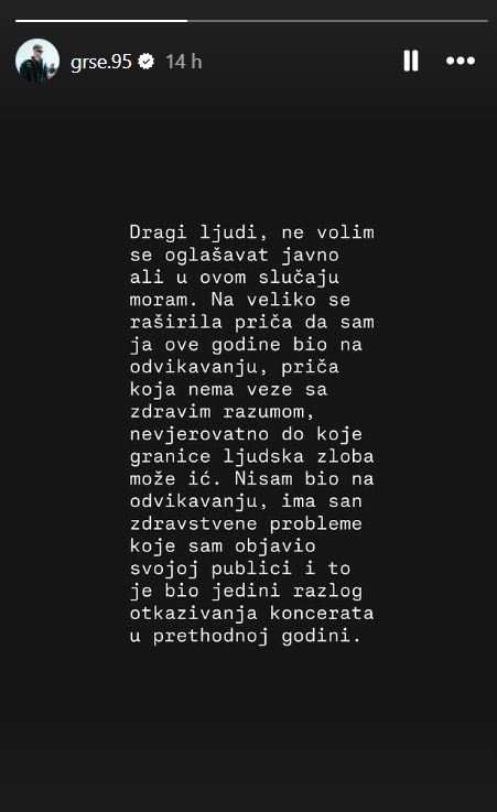 Reper Grše oglasio se putem Instagrama kako bi demantirao glasine koje su se posljednjih dana počele širiti društvenim mrežama. U objavi je poručio da nikada nije bio na odvikavanju te da su takve tvrdnje u potpunosti netočne.