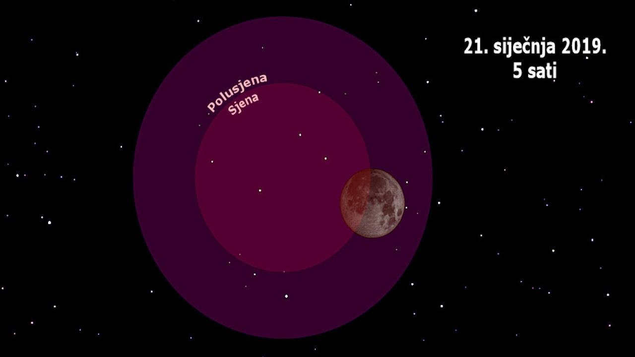 U ranim jutarnjim satima dana 21. siječnja (ponedjeljak), Mjesec će proći kroz sjenu Zemlje i biti potpuno pomračen na malo više od sat vremena. Mjesec će početi ulaziti u sjenu našeg planeta u 4.33 h, dok će potpuna pomrčina započeti u 5.40 h.
