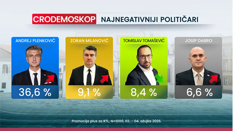 Na ljestvici najnegativnijih političara ponovno prednjači premijer Plenković, kojeg takvim smatra 36,6 posto ispitanika.