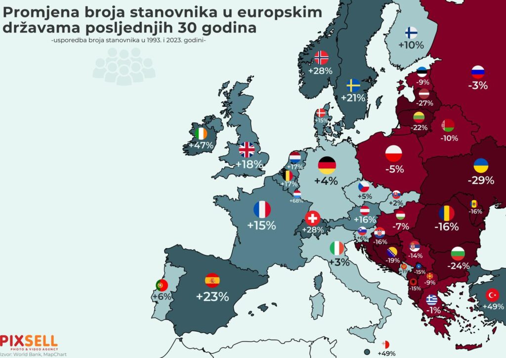 Infografika prikazuje promjene u broju stanovnika Europe tijekom posljednjih 30 godina, uspoređujući stanja iz 1993. i 2023. u postotcima. Tako je, primjerice, Turska zabilježila rast stanovništva od 49%, a Irska od 47%, dok je Hrvatska doživjela pad od 16%.
