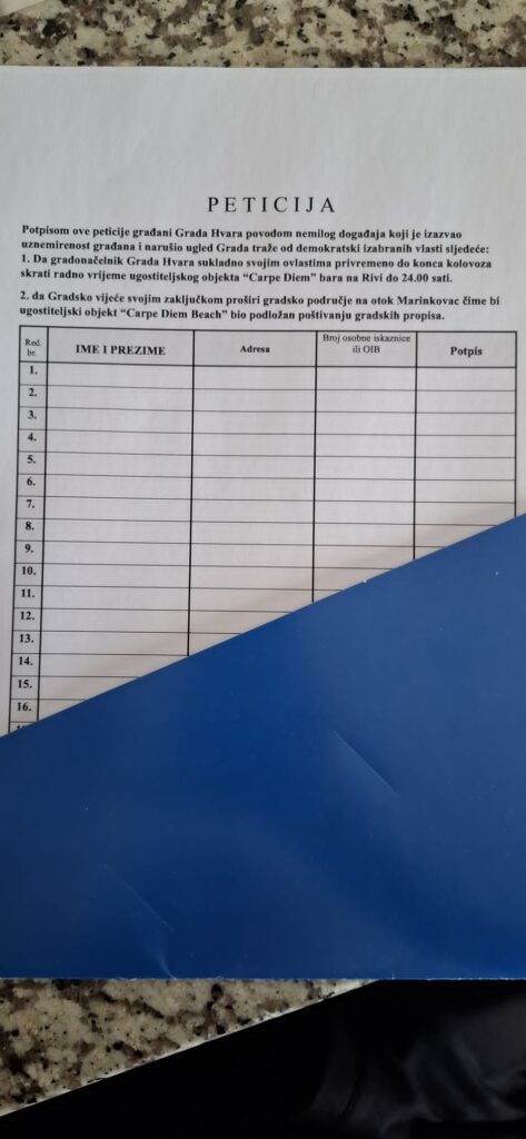 Večeras će se ponovno okupiti na rivi, gdje će se potpisivati peticija upućena Gradskom vijeću Grada Hvara. Peticija zahtijeva od gradonačelnika da privremeno skrati radno vrijeme Carpe Diema na rivi do 24 sata do kraja kolovoza. Također, peticija traži proširenje gradskog područja na otok Marinkovac, čime bi ugostiteljski objekt “Carpe Diem Beach” postao podložan poštivanju gradskih propisa.