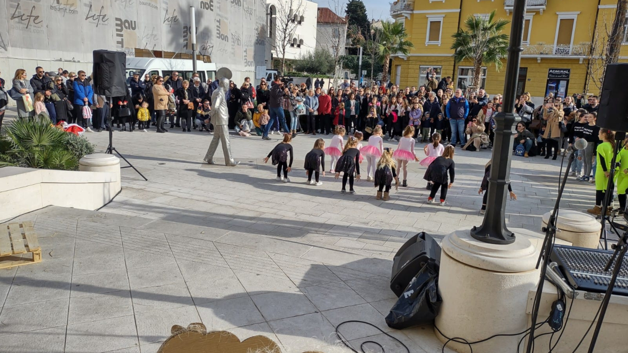 Na Trgu Gaje Bulata, ispred zgrade Hrvatskog narodnog kazališta Split, jutros je održan božićno-novogodišnji program „Ususret Božiću s veseljem“ u kojem su sudjelovala djeca, ali i odrasli, iz Centra Juraj Bonaći, Talent Studia M, Cheerleading kluba Noa, Baletnog studija Školjkica te dječjeg zbora Srdelice, uz nastup seniorki Splitskih mažoretkinja.