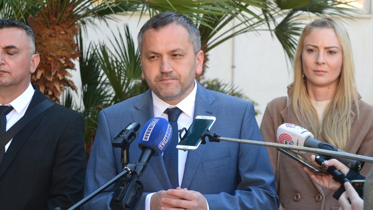 Mate Šimundić, kandidat Domovinskog pokreta za splitsko-dalmatinskog župana pred zgradom županije održao je konferenciju za medije na temu županijske administracije s gotovo 100 savjetnika, a usporedno čak 30 tisuća nezaposlenih.