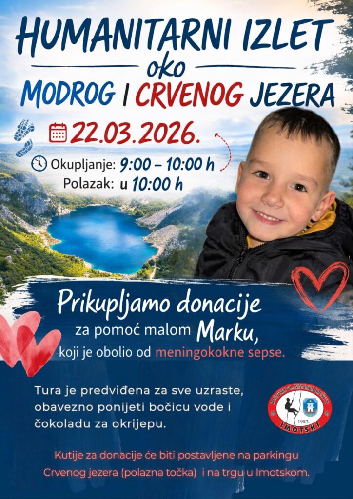 U nedjelju, 22. ožujka 2026., održat će se humanitarni izlet oko Modro jezero i Crveno jezero s ciljem prikupljanja pomoći za malog Marka iz Prološca koji boluje od meningokokna sepsa.