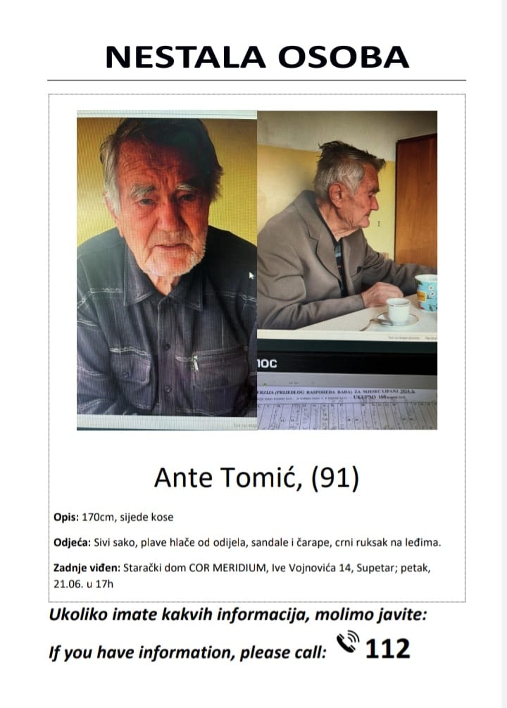 Splitski HGSS izvijestio je kako je u tijeku intenzivna potraga za 91-godišnjim Antom Tomićem, koji je nestao u petak oko 17 sati iz Doma za stare i nemoćne Cor Meridium u Supetru na otoku Braču.