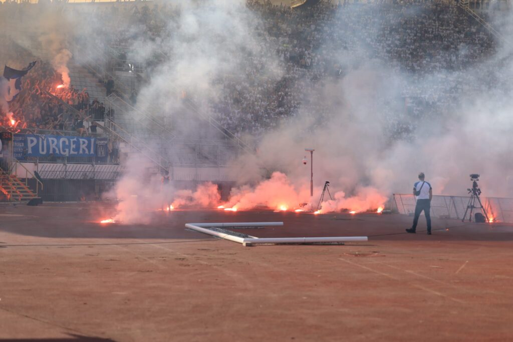 71 – Bakljada gostujućih navijača. Boysi zasuli teren pirotehnikom, utakmica se stopirala