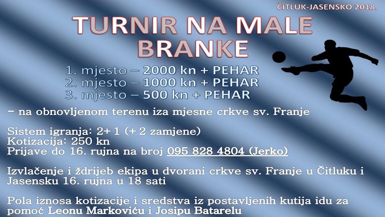 U Čitluku i Jasensku održat će se 3. po redu „Turnir na male branke“ iza mjesne crkve sv. Franje. Kotizacija po ekipi je 250 kuna, a najbolji od najboljih borit će se za vrijedne nagrade. Tako će prvoplasirana ekipa biti „teža“ za dvije tisuće kuna i pehar, druga ekipa Turnira ponijet će kući tisuću kuna i pehar dok će ekipa na trećoj poziciji sa sobom ponijeti 500 kn i pehar.