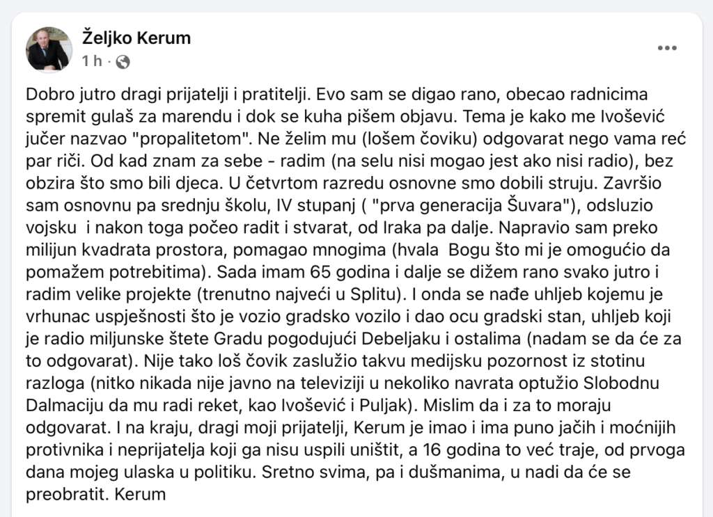–Dobro jutro dragi prijatelji i pratitelji. Evo sam se digao rano, obećao radnicima spremit gulaš za marendu i dok se kuha pišem objavu, započeo je Kerum svoj post, u kojem se osvrnuo na Ivoševićeve prozivke te opisao svoj životni i radni put.