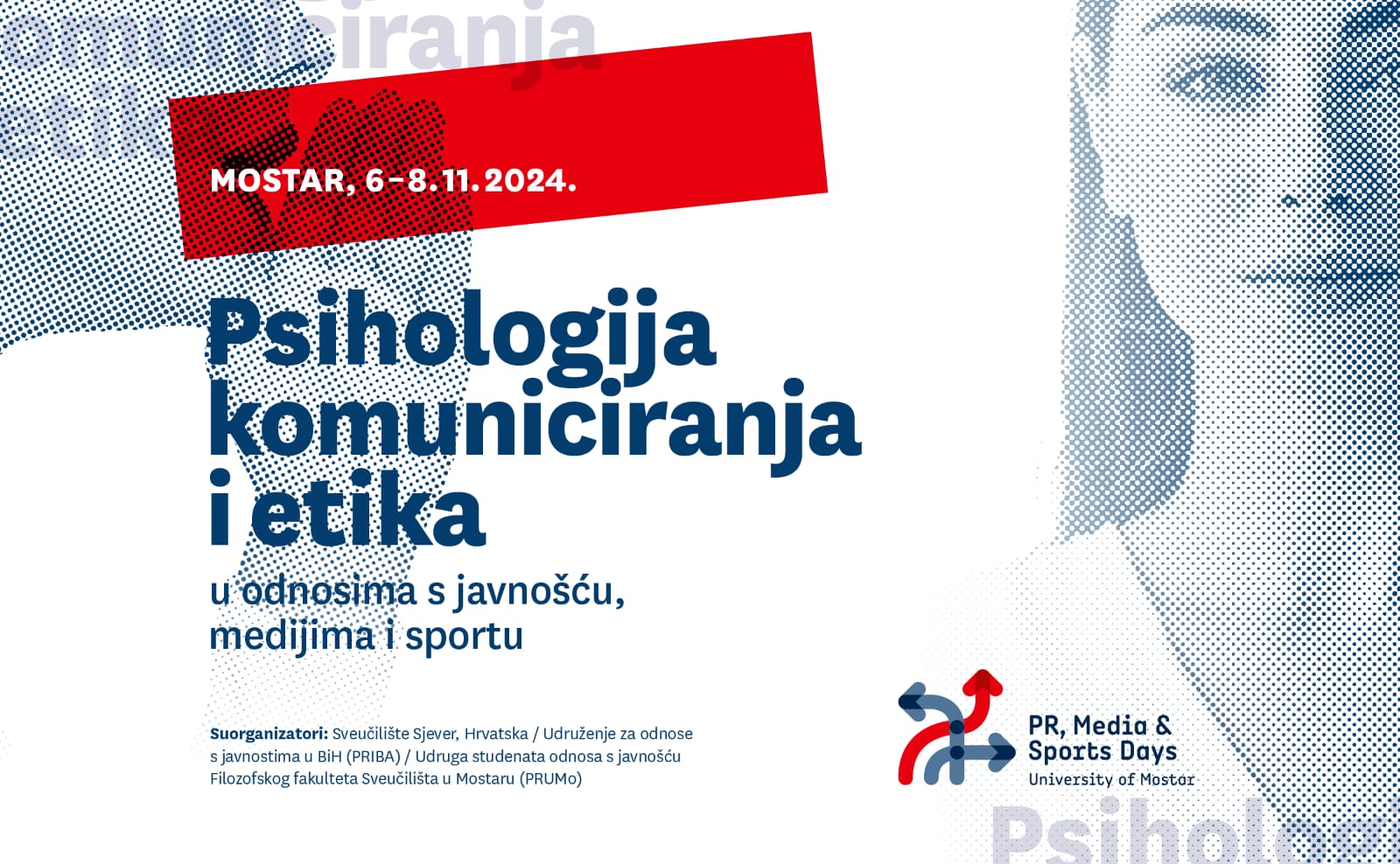 Studij odnosa s javnošću i Studij novinarstva Filozofskog fakulteta Sveučilišta u Mostaru s ponosom najavljuju devetu po redu konferenciju „PR, Media & Sports Days University of Mostar“ koja će se održati od 6. do 8. studenog 2024. godine u prostorijama Sveučilišne televizije, uz izravan televizijski prijenos. Suorganizatori ovogodišnje konferencije su Sveučilište Sjever iz Republike Hrvatske, Udruženje za odnose s javnostima u BiH – PRIBA te Udruga studenata odnosa s javnošću Filozofskog fakulteta Sveučilišta u Mostaru – PRUMO.