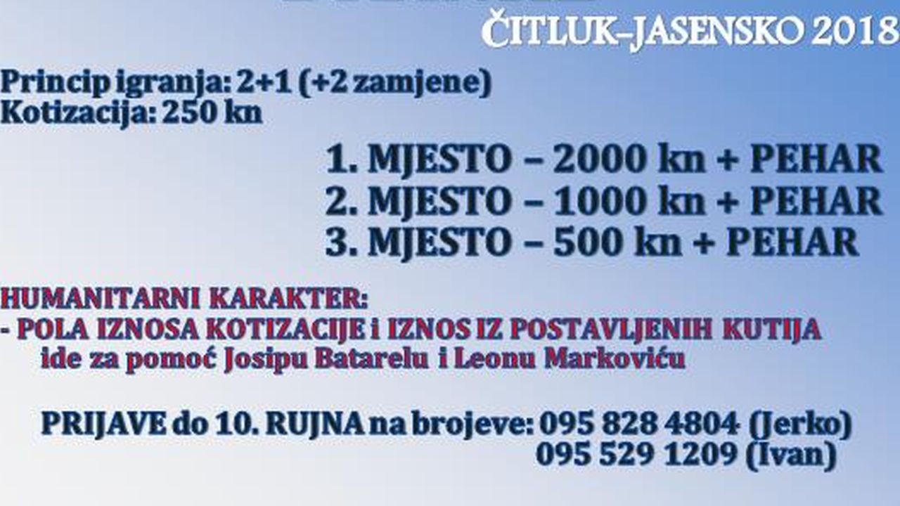 Prijave za ovaj Turnir, koji se igra na principu 2+1 igrač, su do 10. rujna na brojeve: 095 828 4804 (Jerko) i 095 529 1209 (Ivan).