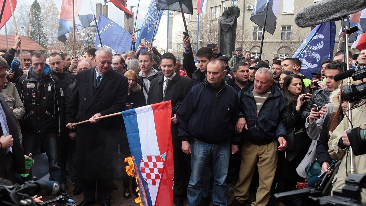 Haaški optuženik i vođa Srpske radikalne stranke zapalio je u srijedu ispred beogradske Palače pravde hrvatsku zastavu rekavši kako želi poslati poruku “hrvatskoj ustaškoj državi” kao odgovor na zahtjeve hrvatskih dužnosnika da se vrati u haaški pritvor.