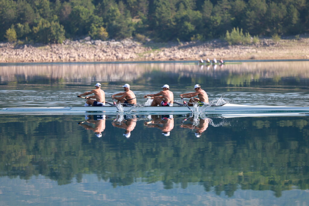 Jezero okupano u suncu, tišinu povremeno prekidaju samo ptice hvatajući brzinu i štrapajući po vodenoj ledini prije nego se odlijepe od piste i polete. Braće nema na vidiku, gledamo s jednog uzdignutog mjesta u daljinu. To mjesto je popularno, očito, na par mjesta su ostaci od roštilja, nagorena drva, ali i na naš užas, puno limenki. Tu i tamo odbačeni kondomi, definitivno mjesto nije samo za piknik. Braće Sinkovića i braće Lončarić, Antona i Patrika, novih partnera u četvercu, nema i dalje. Prošlo je deset minuta, prošlo je dvadeset. Već će devet sati. Nismo valjda zakasnili? Neee… Samo su oni produžili trening. Eto ih uskoro, ali nije samo jedan čamac. Ima ih više, jedan četverac na pariće domaćih, splitskih snaga. Jedan češki četverac. Nekoliko samaca. I pratnja je tu. Braća, Sinkovići i Lončarići, veslaju goli do pasa na oduševljenje fotoreporterke Dee. A tek kad su izašli iz čamca, pa ga podigli iznad glave kao da je od papira, kad su se “raširila” ramena, iskočili bicepsi, tricepsi…
