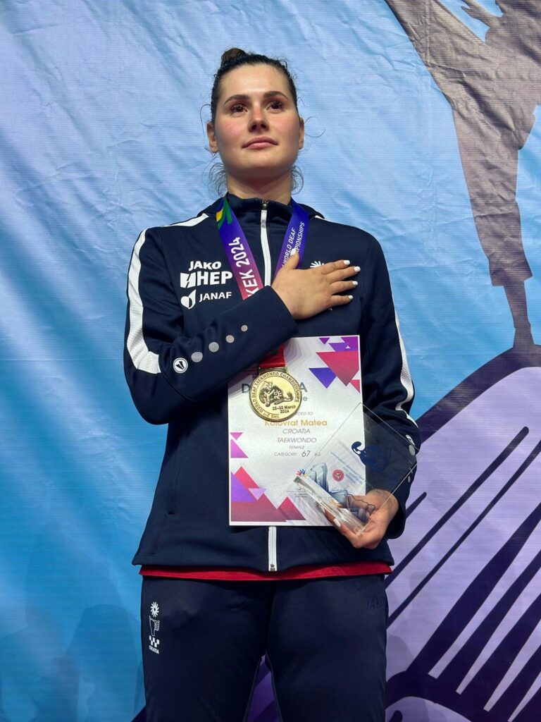 To je najveća pobjeda i trenera Veljka Laure Šiše i kompletnog tima u gradu pod Marjanom jer su od takvih roditelja prepoznati i priznati kao najbolje za svoje dijete. Matea Kolovrat je izvrsna i u taekwondou za čujuće te se na putu do naslova svjetske prvakinje gluhih prošetala. U prvom je kolu kao nositeljica bila slobodna, u drugom je s 12:3 i 13:0 po rundama deklasirala reprezentativku Koreje Lee Dasom, da bi u polufinalu preskočila i Ukrajinku Mariju Levanovych. U finalu je za kraj pala i Grkinja s novih 2:0 u rundama za obranu naslova svjetske prvakinje i Hrvatsku zastavu na najvišoj stepenici pobjedničkog postolja.