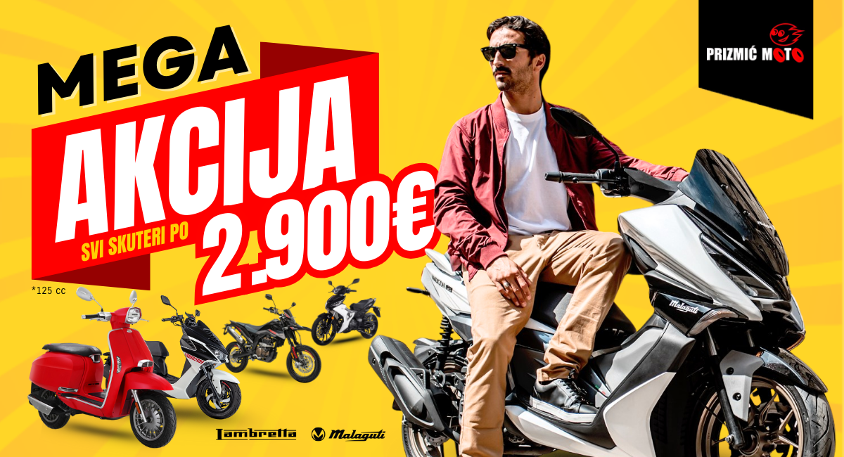 Prizmić Moto salon pripremio je pravu poslasticu za sve ljubitelje dvaju kotača – svi skuteri legendarnih talijanskih marki Lambretta i Malaguti sada su dostupni po posebnoj cijeni od samo 2.900 EURA! Uz njih, na akciji su i odabrani e-bicikli talijanske marke FANTIC. Ponuda vrijedi do isteka zaliha, pa je pravo vrijeme da uhvatite svoj novi gradski ili terenski stroj.