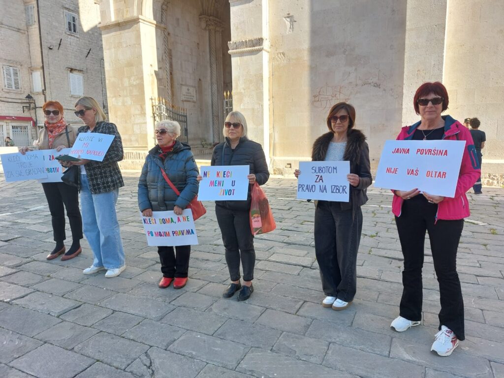 Danas, u subotu 5. travnja, od 8:30 do 9:30 sati na Trgu Ivana Pavla II u Trogiru, održano je mirno okupljanje građanki i građana pod nazivom “Sloboda nije na koljenima”, kao odgovor na prisustvo molitelja koji već više od dvije godine koriste javni prostor za javno izražavanje stavova koji ne ostaju unutar granica osobne vjere, već prelaze u političku poruku, poruku protiv prava žena, protiv slobode izbora i protiv dostignuća suvremenog društva.