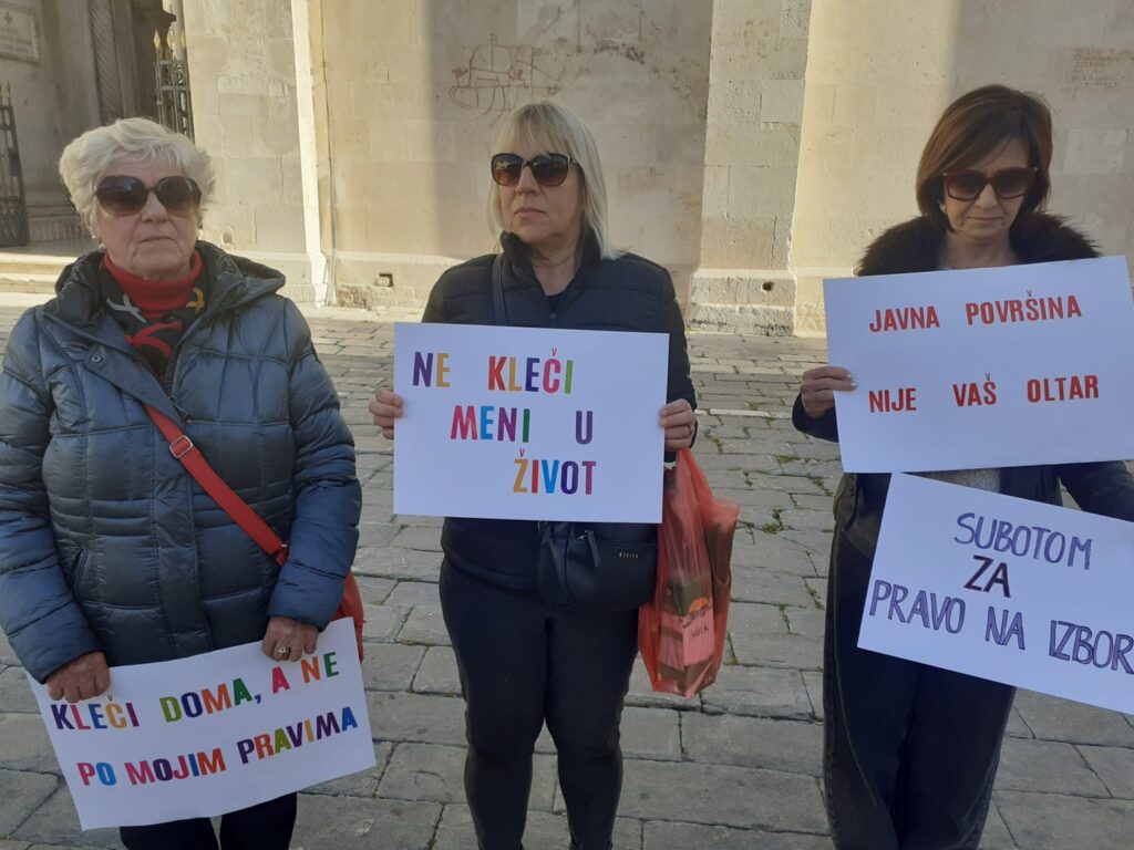 “Kleči doma, ne po mojim pravima!”, „Subotom za pravo na izbor”, “Ne kleči meni u život”, „Kleči doma, trg je za sve građane”, „Kleči za sebe, ne protiv mene”,”Javna površina nije vaš oltar”.