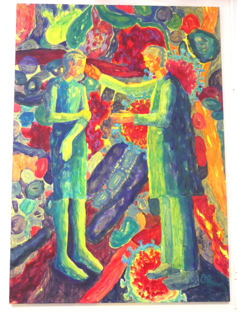 -U ovo blagdansko vrijeme iščekivanja Božića, poželjela sam darovati svoju sliku onima koji nam daruju svoje znanje, vrijeme i brigu – liječnicima Klinike za infektologiju KBC-a Split. Prikaz je to liječnika koji brine o pacijentu, u kompoziciji s virusima, bakterijama i drugim mikroorganizmima. Slika je dobila i vedar naziv koji nosi najljepšu iskrenu želju, a koja je ujedno i poznati dalmatinski pozdrav ‘Zdravi bili’. Nadam se da će ovaj dar biti poticaj i drugim umjetnicima da svojim doprinosom, kreativnim i likovnim, uljepšaju bolničke prostore. Neka moja slika, svojim žarkim koloritom, doista svakom poruči ‘Zdravi i veseli bili’, naglasila je umjetnica.