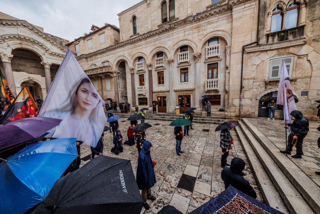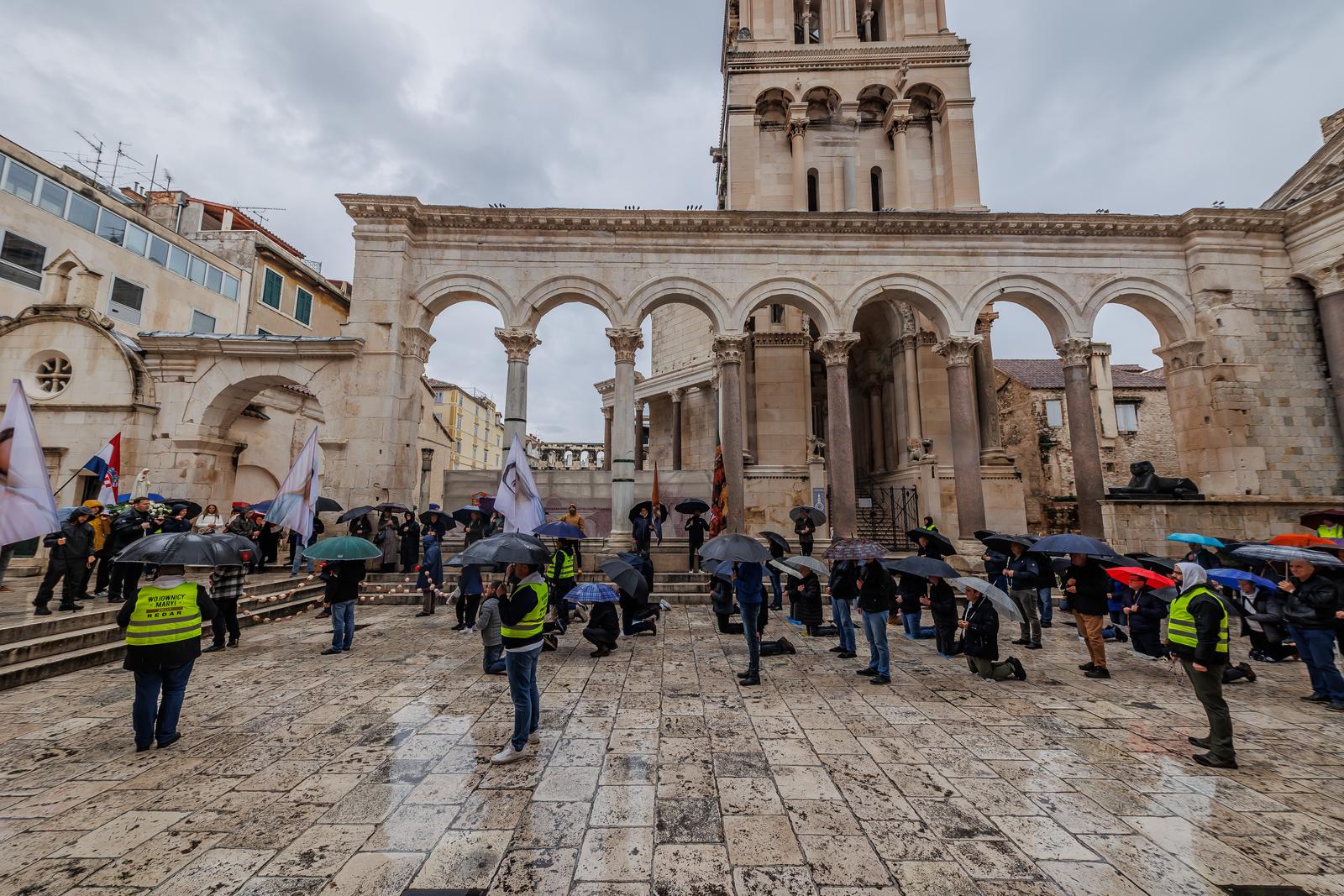 Muškarci su i ovu subotu ujutro molili krunicu na splitskom Peristilu, unatoč kiši koja ih nije spriječila.