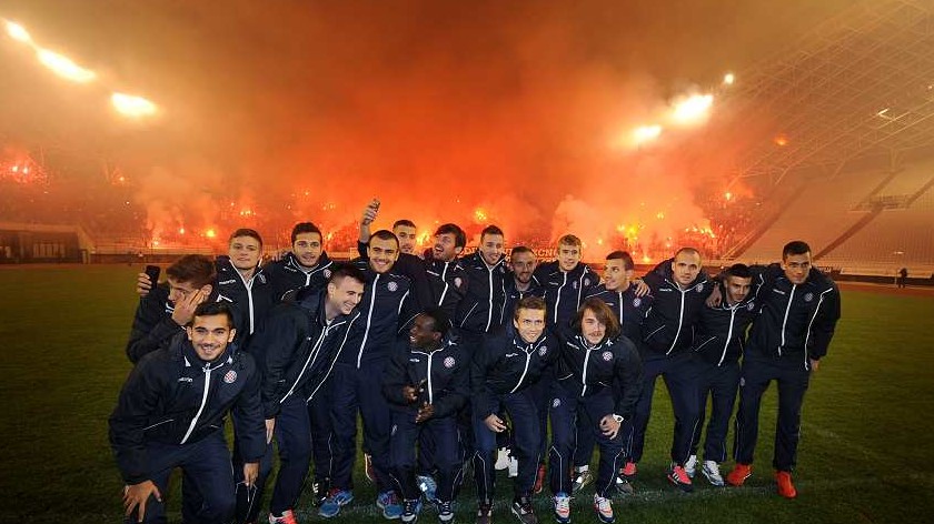 21.23 sati – Igrači Hajduka upravo su izašli na poljudski travnjak, te mobitelima snimaju sjever tribine koji uz bakljadu pjeva “Dalmacijo, moja ružo procvala…”