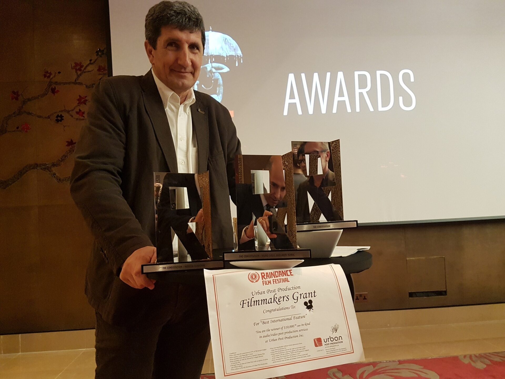 Jedan od najboljih filmskih ostvarenja hrvatske kinematografije, film Rajka Grlića – ‘Ustav Republike Hrvatske’ trijumfirao je na londonskom Raindance film festivalu.Ova ljubavna priča o mržnji na vodećem festivalu nezavisnog filma u Velikoj Britaniji i Europi osvojila je nagradu za najbolji film, najbolji scenarij (Rajko Grlić i Ante Tomić) te najbolje glumačko ostvarenje (Nebojša Glogovac) koje je preuzeo Ante Tomić. Time je Ustav Republike Hrvatske postao prvi film u četvrt stoljeća dugoj tradiciji Raindancea koji je uzeo tri glavne nagrade. U fokusu ovog festivala su nezavisni i nekonvencionalni filmovi, a moto ovogodišnjeg izdanja bio je ‘Discover. Be discovered’. Publika i stručni žiri su očito otkrili vrijednost filma Ustav Republike Hrvatske koji se pita da li se netko uronjen u predrasude i mržnju može pretvoriti u normalno ljudsko biće i može li netko takav ići i korak dalje i pokazati da je ispod ledene maske satkan od ljubavi. Tako i kritika objavljena na The Panopticu povodom prikazivanja filma na Raindanceu kaže: “Zabavan, nježan i nevjerojatno relevantan, redatelj Rajko Grlić i scenarist Ante Tomić stvorili su moderno remek-djelo u životnom filmu“ a Screen Daily prenosi: „Ustav Republike Hrvatske trijumfirao na Raindanceu“.