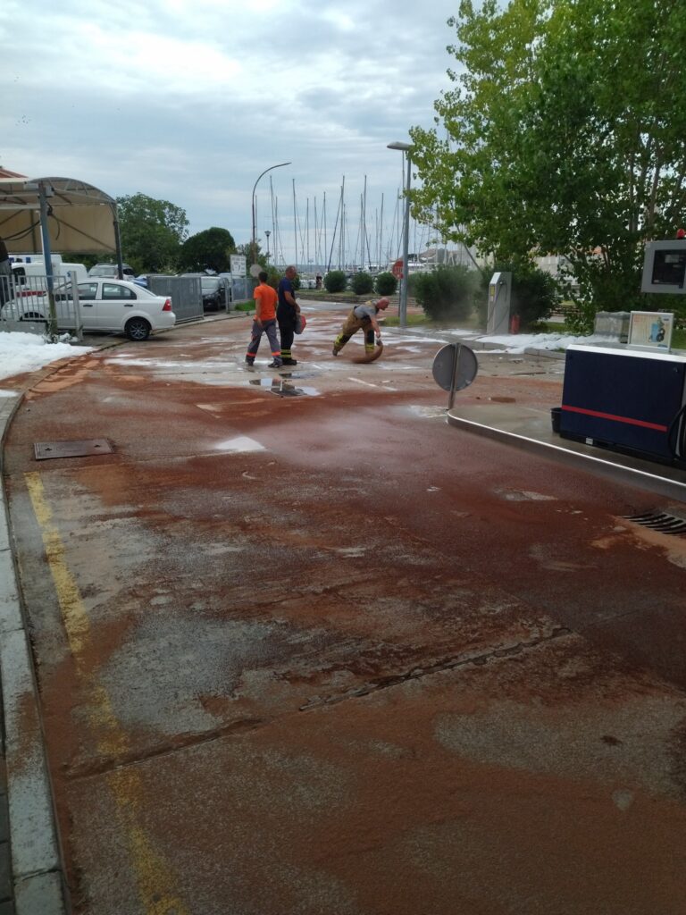 Vatrogasci su potom u suradnji s djelatnicima INE, ACI-ja i Lučke kapetanije postavili branu i tretirali morsku površinu disperzantima. Po stavljanju situacije pod kontrolu, izvršeno je pretakanje preostalog benzina iz autocisterne pod strogo kontroliranim uvjetima. Nakon toga autocisterna je uklonjena iz ugrožene zone, a površina očišćena i tretirana disperzantima i apsorbentima.