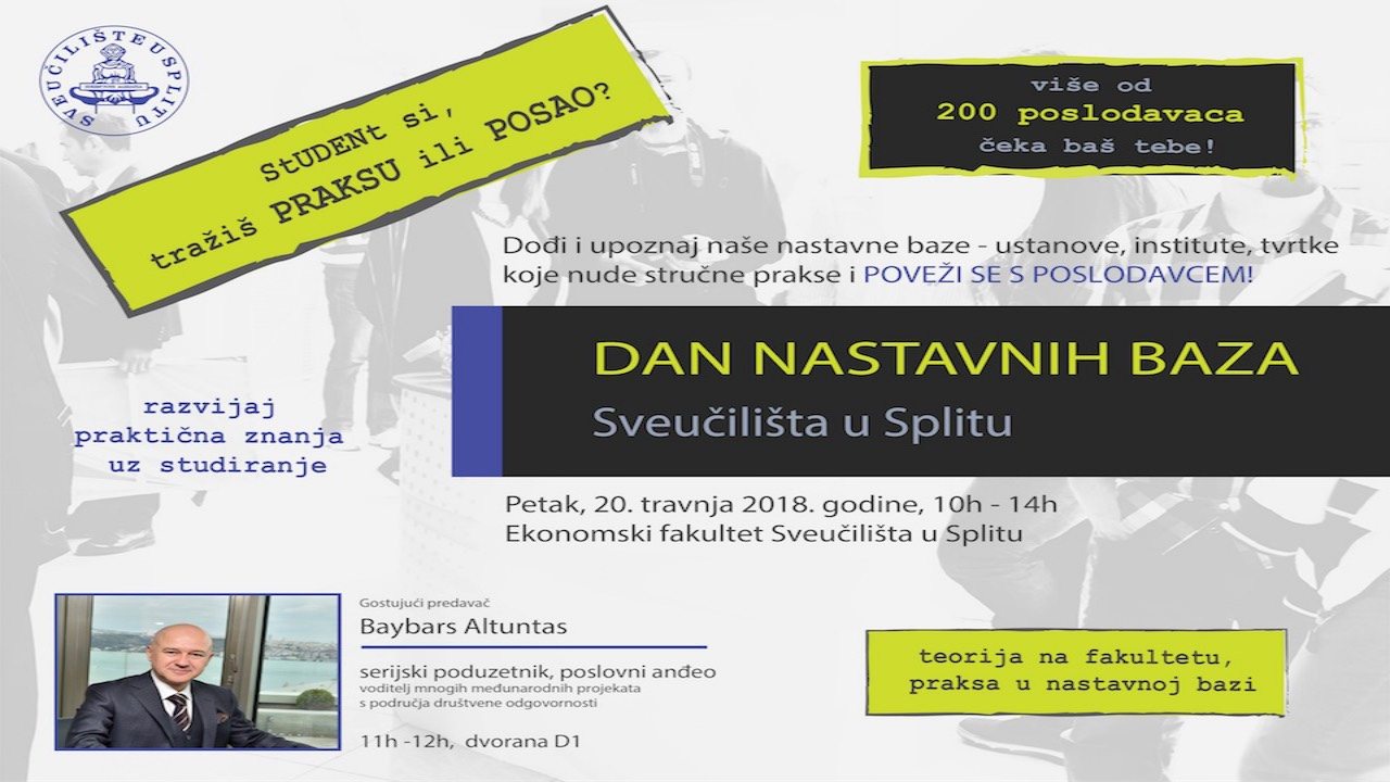 U okviru Dana nastavnih baza predavanje “A road map for University Students: How to launch a business from scratch as a university student” održat će svjetski poznati turski poduzetnik, investitor i promotor start-upova te osnivač i predsjednik Svjetskog foruma poslovnih anđela Baybars Altuntaş u vremenu od 11 do 12 sati u dvorani D1 za sve studente zainteresirane za poduzetništvo.