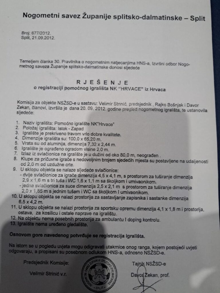 Iz Hrvaca su nam poslali i potvrdu o registraciji pomoćnog terena te piše kako se na istome mogu odigravati utakmice “onog ranga kojem postojeći uvjeti odgovaraju, a propisani su posebnom odlukom HNS-a, odnosno NSŽSD-a”