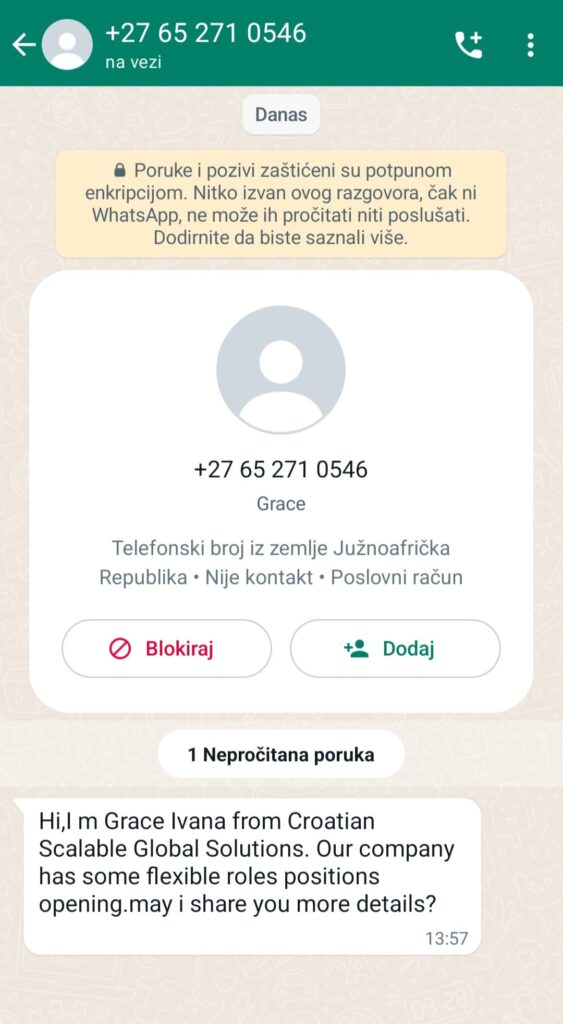 Ako na WhatsAppu dobijete poruku s južnoafričkog broja, budite jako oprezni. Naime, pošiljatelji se predstavljaju kao hrvatska podružnica tvrtke Scalable Global Solutions te navodno pomažu hrvatskim firmama pronaći zaposlenike.