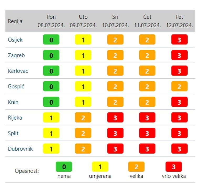 Sljedećih dana nastavlja se pritjecanje još toplijeg zraka po visini, što će za posljedicu imati sve veći stupanj upozorenja na toplinski val koji može utjecati na zdravlje.