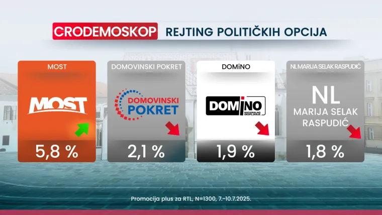 Most je na četvrtom mjestu s ovomjesečnom podrškom od 5.8 posto (prema 5.5 posto iz svibnja). Na petom je mjestu DP s podrškom od 2.1 posto (prema 2.3 posto iz lipnja), a slijedi Domino s 1.9 posto (u lipnju 2.2 posto). Slijedi Nezavisna lista Marije Selak Raspudić s izborom od 1.8 posto (prema prošlomjesečnih 2.4 posto).