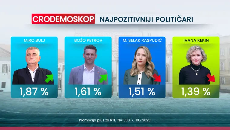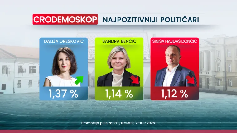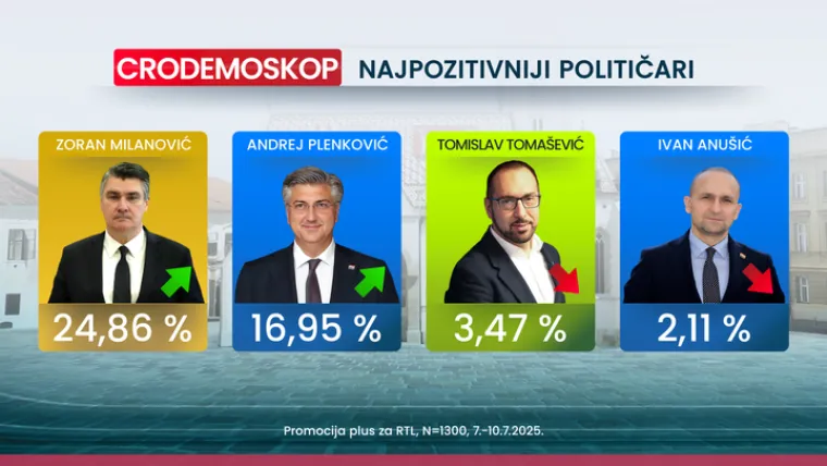 Na vrhu ljestvice najpozitivnijih hrvatskih političara je predsjednik Republike Zoran Milanović s izborom od 24.9 posto ispitanika (u odnosu na 23,8 posto iz lipnja). Predsjednik Vlade Andrej Plenković je drugom mjestu ove ljestvice s izborom od 17 posto (prema 15.6 posto iz prošlog mjerenja u lipnju). Na trećem je mjestu Tomislav Tomašević s izborom od 3.5 posto (prema lipanjskih 6.1 posto). Četvrto mjesto s izborom od 2.1 posto drži Ivan Anušić (jednako kao i u lipnju).
