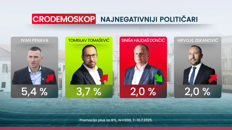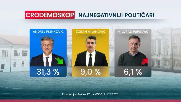 Ljestvicu najnegativnijih hrvatskih političara i dalje uvjerljivo predvode čelni ljudi države, premijer Plenković i predsjednik Milanović. Na samom vrhu ove ljestvice je Andrej Plenković s izborom 31.3 posto (u odnosu na 36.9 posto iz lipnja). Predsjednik Milanović je na drugom mjestu ove “negativne ljestvice” s izborom od 9 posto (isto kao i u lipnju). Na treće se mjesto vratio Milorad Pupovac s izborom od 6.1 posto (u lipnju 3.6 posto).