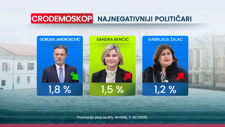 U top 10 najnegativnijih domaćih političara još su: Gordan Jandroković (1.8 posto), Sandra Benčić (1.5 posto) i Gabrijela Žalac (1.2 posto).