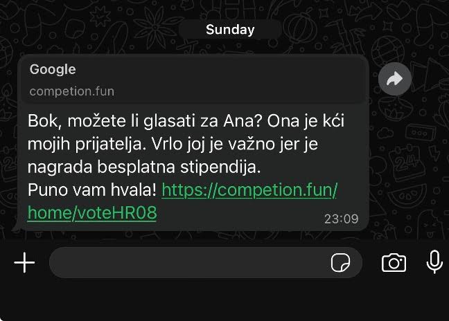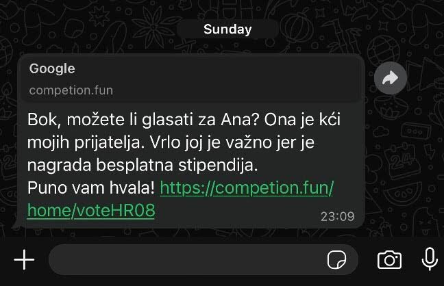 Od početka ove godine bilježi se porast online prijevara, a posljednjih dana WhatsAppom se intenzivno širi nova prijevarna poruka koja posebno pogađa korisnike jer se oslanja na emocije. Riječ je o poruci u kojoj se traži da se glasa za dijete u navodnom online natjecanju, najčešće za djevojčicu imena Ana ili Marija.